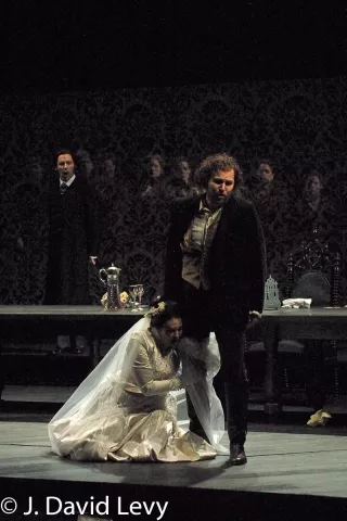 De vieilles rancœurs viennent une fois de plus nourrir le discours belliqueux d’Edgardo et Ashton, qui jurent d’en venir au sang. Pour autant, rien n’y fait : conformément au vœu du frère, Lucia épouse Arturo. Mais les noces virent soudain au tragique : prise de démence, Lucia poignarde son époux ; elle apparait tachée de sang, et, comme absente, s’imagine mariée à Edgardo. Au terme d’une scène traduisant sa folie complète, Lucia s’écroule. Morte.