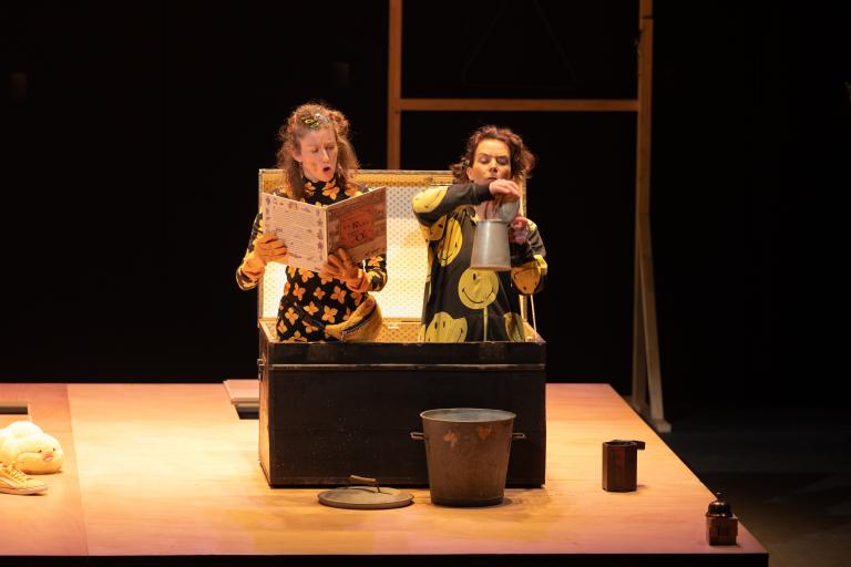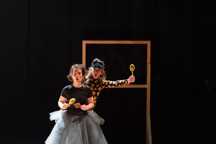 Dans un grenier farfelu, une soprano frelatée loue les vertus de l’asphalte, insulte sa mère et réalise la recette des tomates bouillies. À sa rencontre, une percussionniste polissonne entrechoque mille et un objets du quotidien, faisant tintinnabuler des pièces de monnaie, résonner un étui, et crépiter le chant des oiseaux. À l’unisson, elles dansent un Cha-cha-cha en pyjama et bermuda en toute déraison. Un cabinet d’absurdités, rempli de gags dadaïstes et joyaux harmonieux.